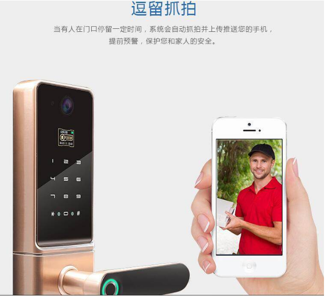 監(jiān)控?cái)z像頭和智能鎖連接一體,起到有效防范和震懾作用,當(dāng)有人在門口停留一定時(shí)間,系統(tǒng)會(huì)自動(dòng)抓拍并傳送到手機(jī),提前預(yù)警,保護(hù)家人安全。